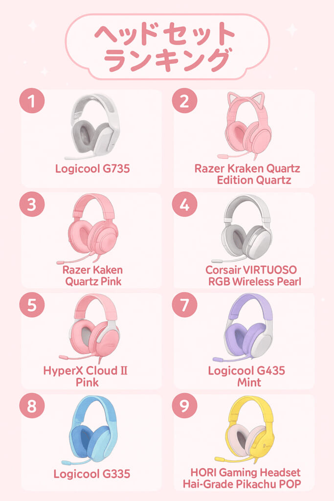 4Razer Kraken Quartz Pink (レイザー)*猫耳なしのシンプル可愛いピンク色モデル。冷却ジェル入りイヤークッションで蒸れにくく快適。単一指向性の収納式マイクは声だけをクリアに拾い邪魔にならない。可愛さと実用性を兼ね備えたコスパ最強ヘッドセットと評され、価格は1万円前後と手頃。重量は約300g台で装着感も良好です。Amazon