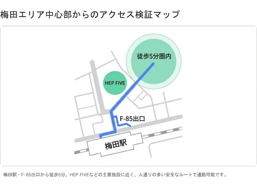 大阪に土地勘がある方なら、「F-85番出口」や「HEP FIVE」周辺がどれほど人通りが多く、明るい場所かご存知でしょう。F-85出口は、東梅田エリアや曽根崎方面へのアクセス拠点であり、常に買い物客や会社員が行き交うエリアです 。