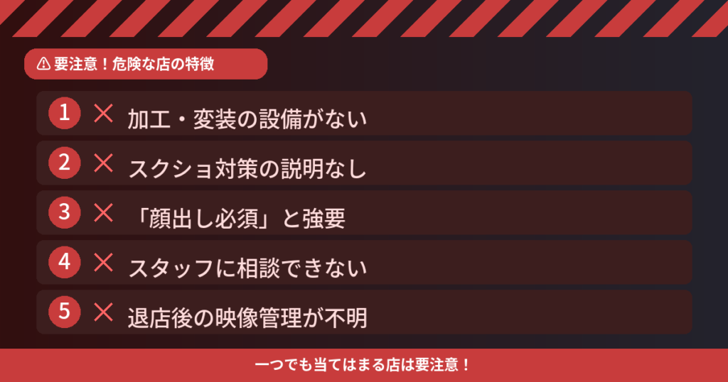この記事では、 顔バレしやすい「危険な店」の特徴を先にお伝えし、 そのうえで安全な環境の見分け方を解説します。