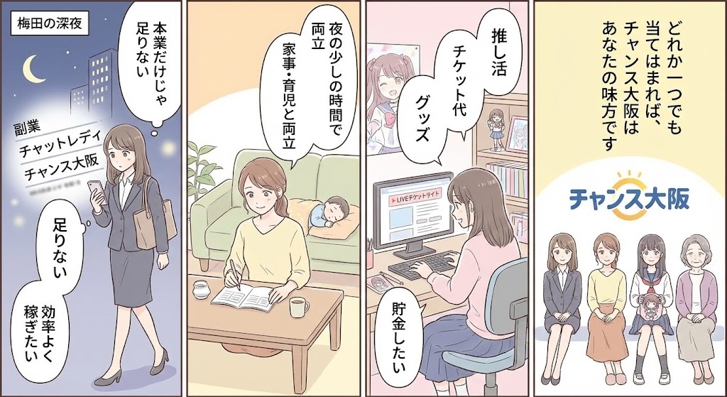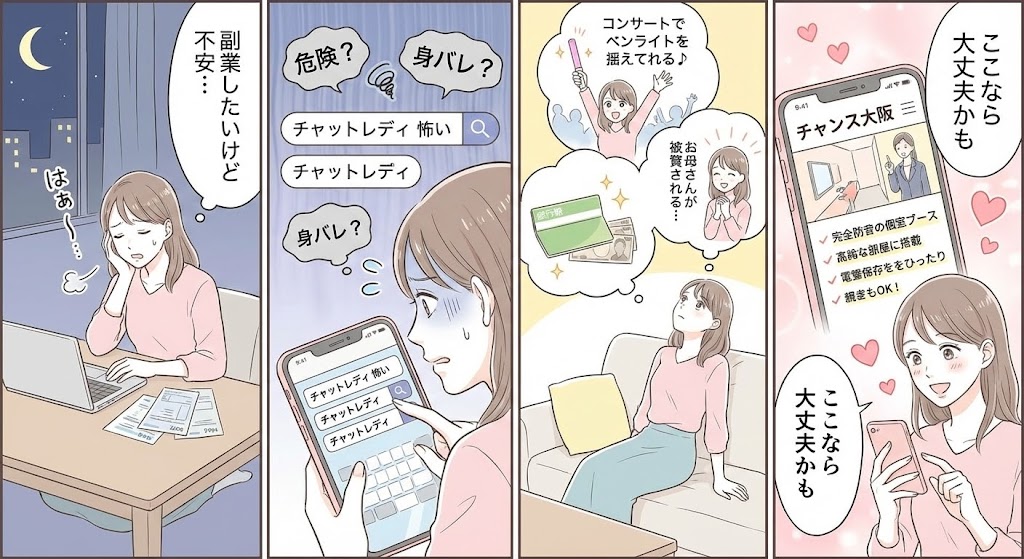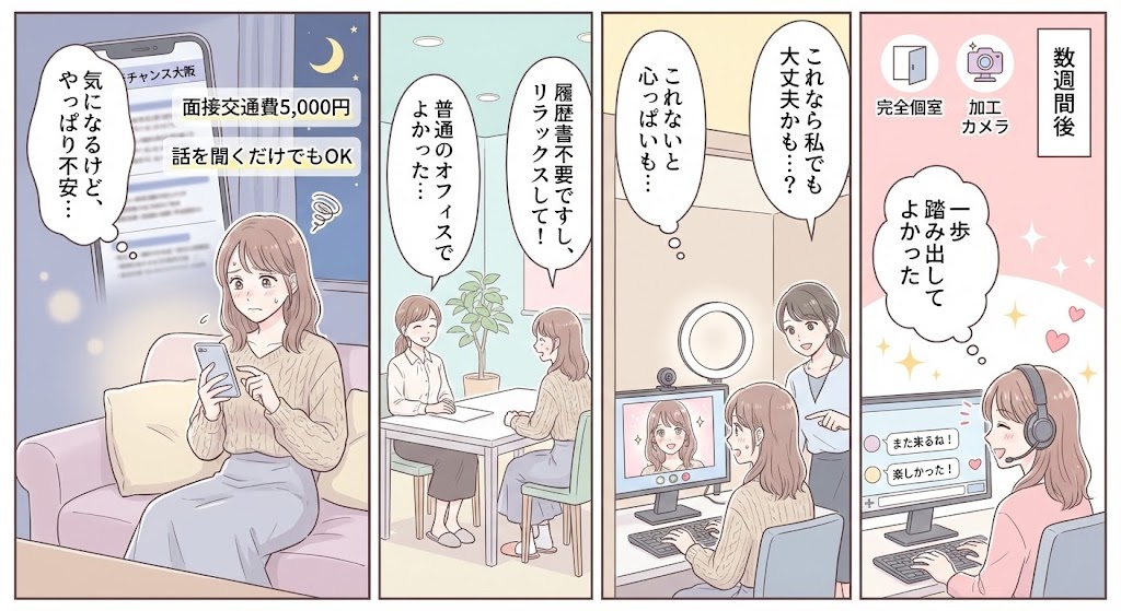 この記事では、大阪・梅田にあるチャットレディ事務所「チャンス大阪」を例に、初心者の方でも安心して働けてモチベーションを保ちやすい理想的な環境とはどんなものかをご紹介します。完全防音で清潔な個室ブース、全室導入の加工カメラによる99.9%の身バレ防止策、自由な出勤制度とノルマ無しの気楽さ、充実したコスプレ衣装やコスメ、Wi-Fiやシャワー完備など、チャンス大阪ならではの魅力を詳しく解説。