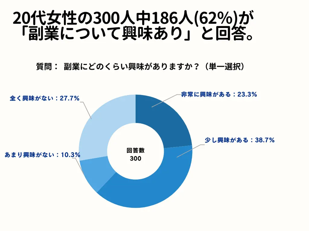 こうした背景から、若い世代の間で副業への関心が年々高まっています。あるアンケートによれば、20代女性300人中 **62%もの人が「副業に興味あり」と回答しました。特にその理由として65.3%が「収入の増加」**を挙げており、お金の不安を解消したい思いがうかがえます。 実際、金欠状態への対策としても「できる限り節約」(76%)に次いで 「副業」(35%)を始める人が多く、副業は収入不足を補う有効策と認識されています。