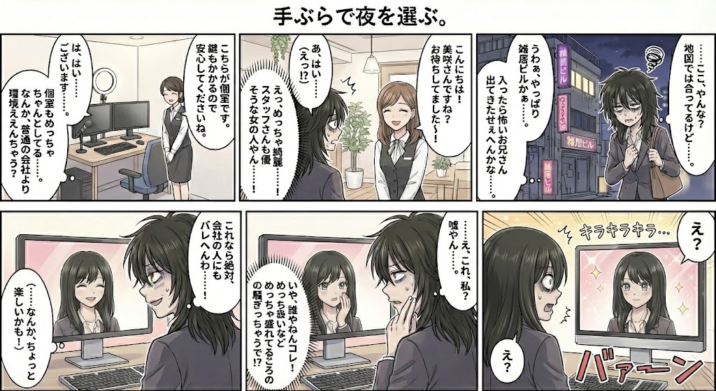 終電後に徒歩やタクシーで帰る場合も、人目がある場所なので危険を感じにくいでしょう。立地が良い分、「遅い時間まで頑張って稼いだけど帰りが怖い…」なんて心配とも無縁です。実際に深夜帯まで働いても、事務所から駅が近いのですぐ帰宅できるという安心感は段違いです。