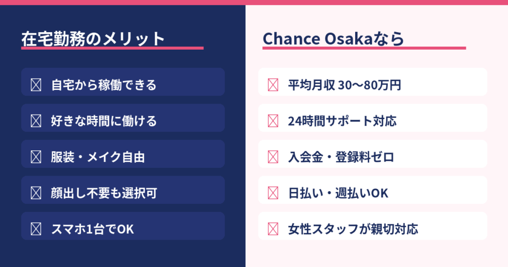 在宅型は自由度が高く、副業や家事・育児との両立がしやすいのが魅力。出勤型は環境が整っていて高収入を目指しやすいのが特徴です。Chance Osakaでは、在宅・出勤どちらにも対応していますので、ご自身のライフスタイルに合わせてご相談ください。