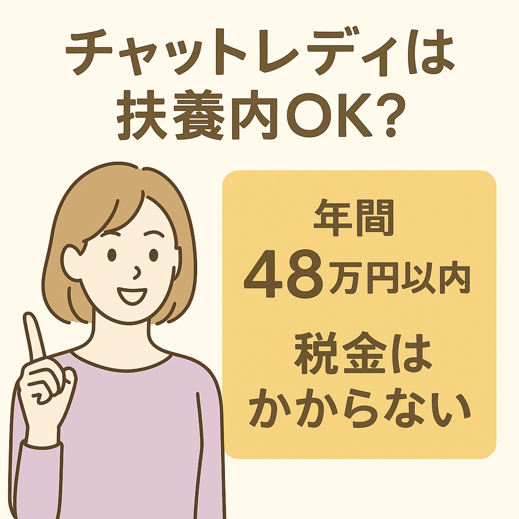 「副収入を得たいけど、扶養から外れると困る…」という主婦の方や学生さんも多いでしょう。ご安心ください、チャットレディとして稼いでも一定の範囲内なら扶養内で問題なく働けます。国のルール上、扶養対象でいるためには年間の所得(収入-必要経費)が48万円以下である必要があります。裏を返せば、1年間の所得が48万円以下であれば確定申告は不要で、税金もかかりません。例えば専業主婦の方がチャットレディ一本で副収入を得ている場合、経費を引いた後の利益が48万円以内なら所得税・住民税ともに非課税で、旦那様の扶養控除も満額適用されます。
