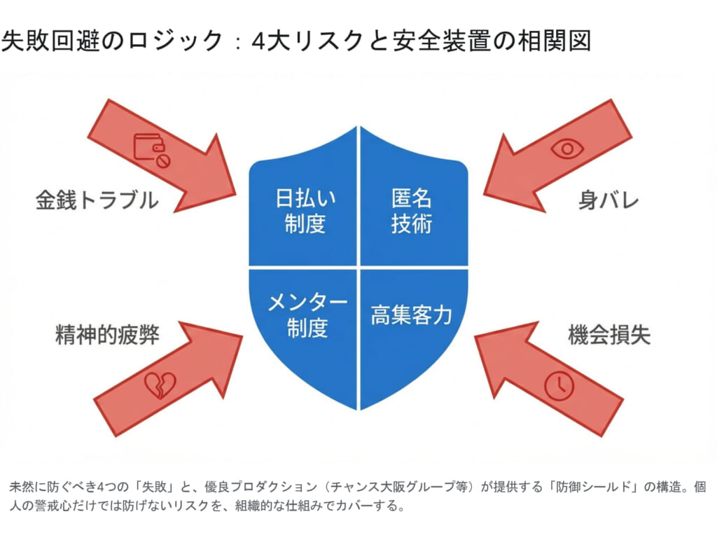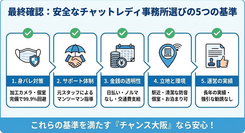 ここまで、論理とデータを用いて、なぜ「チャンス大阪」のような大手・通勤・日払い・サポート完備の店舗を選ぶことが「失敗回避」につながるのかを解説してきた。