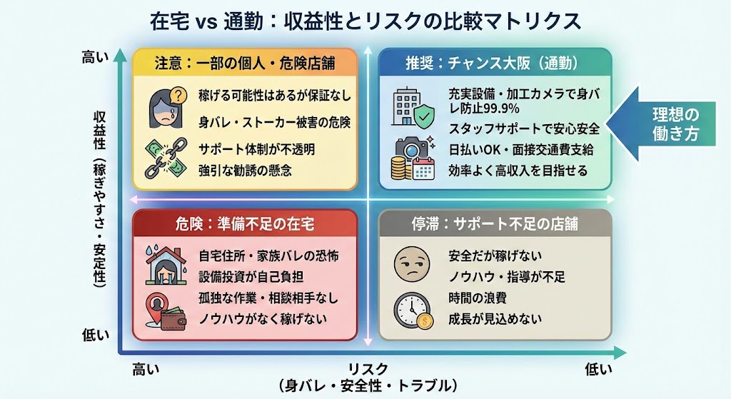 チャットレディを始める際、多くの初心者が陥る典型的な判断ミスが、「手軽そうだから」「家から出たくないから」という安易な理由だけで、いきなり「在宅」を選択してしまうことである。しかし、収益構造とコスト構造を分析すると、初心者が在宅を選ぶことは極めてリスクが高いことがわかる。